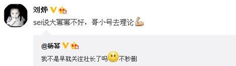 刘烨儿子诺一被胡军取了新小名——小糯米,刘烨不满意名字,配了呕吐表情。但是,刘烨不知道这其实是杨幂女儿的小名,随后,知道实情的刘烨赶紧道歉,还特意发微博求杨幂关注自己。对此,杨幂作出回应,称“我不是早就关注了社长了吗”。6月30日下午,刘烨再次与杨幂互动,回复杨幂:“sei说大幂幂不好,哥小号去理论。”