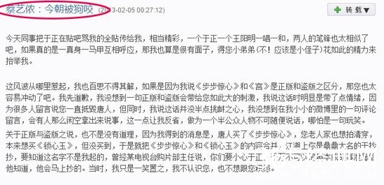 蔡艺侬因此不让幂参加江苏卫视仙剑奇侠传三的宣传活动。而后是杨幂参与了多部于正电视剧的拍摄,但是于正的电视剧《宫锁心玉》,抄了唐人这边的《步步惊心》。加上杨幂在这件事里立场一变再变,否认做过的事……于是就掰了。