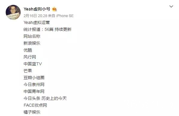 郑爽的微博首秀没有止步于此,她在晚间整理出了一份EXCEL表,上面记录了56家参与报道的媒体。