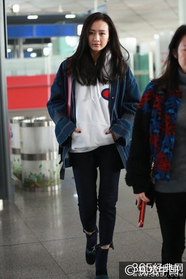 王鸥身穿Stella McCartney牛仔外套搭配Champion卫衣,下身穿深色牛仔裤搭配短靴,恰到好处的露出脚踝,显得很时髦。