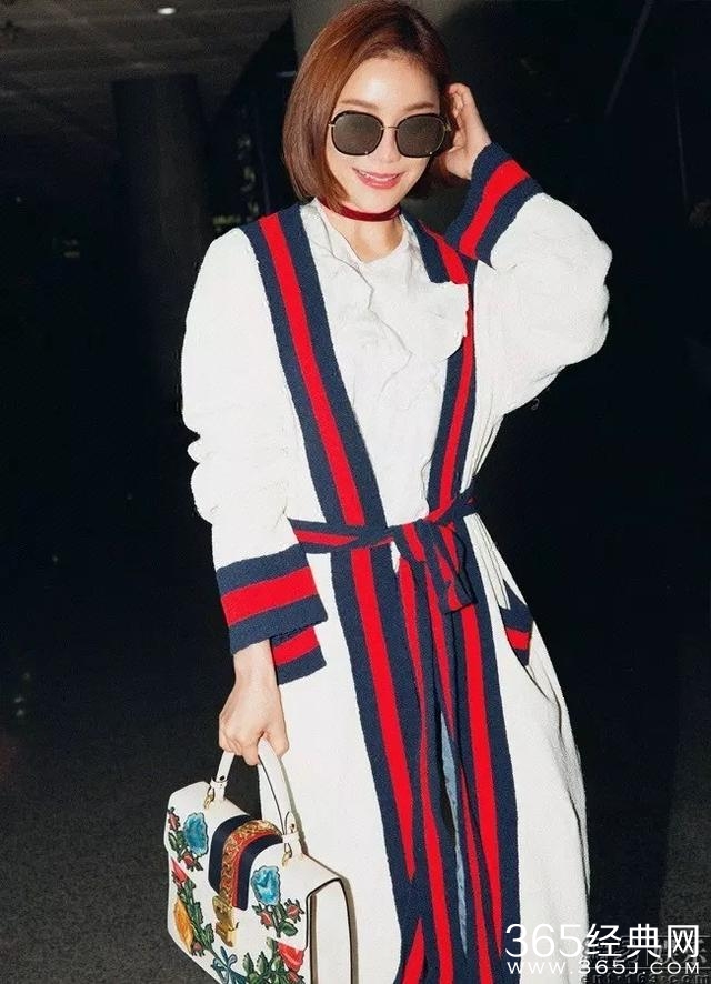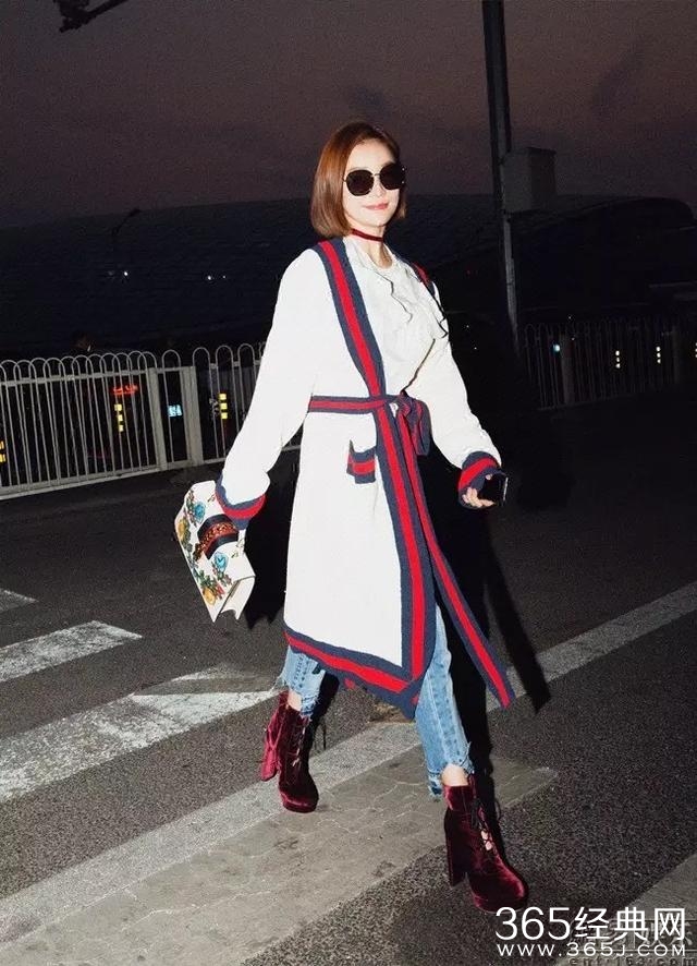 袁姗姗身穿GUCCI白色长款针织衫,脚踩红色天鹅绒高跟靴现身 。