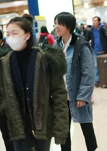 周冬雨带着口罩,扎着丸子头俏皮可爱,窦靖童则身穿白衬衣,外搭牛仔外套,看起来率性十足。