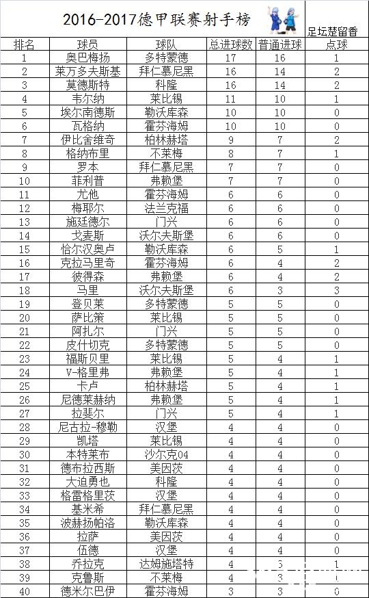 射手榜方面,奥巴梅扬17球位列榜首,莱万16球紧随其后,科隆头号射手莫德斯特与莱万并列第二,罗本7球排名第9,。