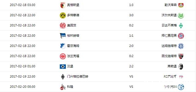 北京时间2月19日凌晨,德甲联赛第21轮先进行7场比赛的较量,对阵情况如下: