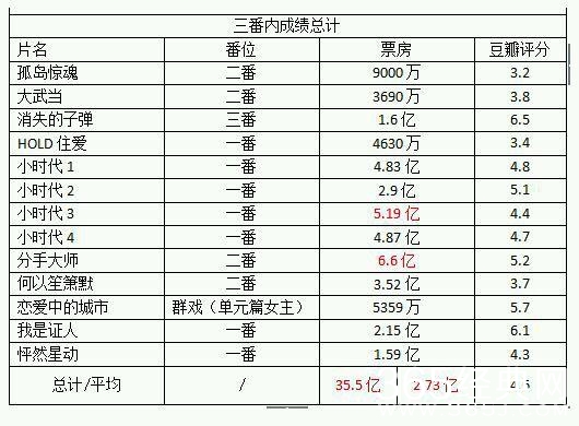 成绩:平均票房:2.73亿 平均分:4.6 一番占比:54%
