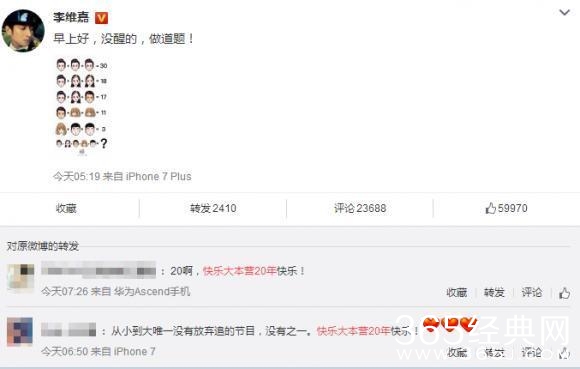 而这个节目也相继捧红了数位芒果台的当家主持,今年是《快乐大本营》播出的20周年,这不,维嘉就在微博上发了一道数学题,最后的答案直指20,寓意就是祝贺节目的20周年。