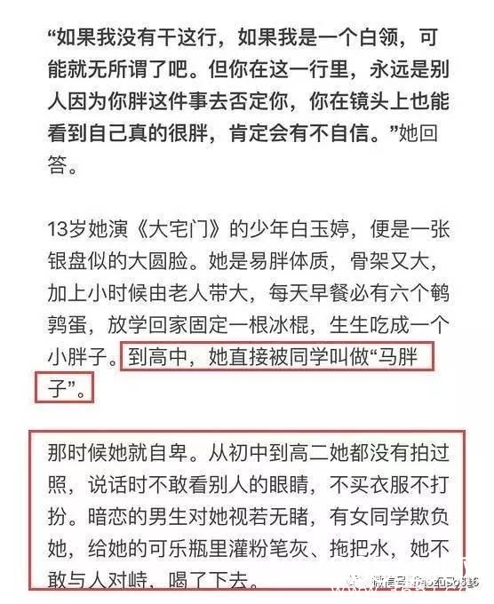 其实如今被评价为“心大”、随和、包容、直言直语的马思纯,潜意识里大概还是有“讨好型人格”的影子——青少年时期,她因为体重问题,曾遭遇过欺凌事件,她曾自曝上学的时候不仅被叫“马胖子”,还被女生欺负喝粉笔灰,也不敢和人对峙,因为对身材长相不自信,不拍照也不买衣服打扮。