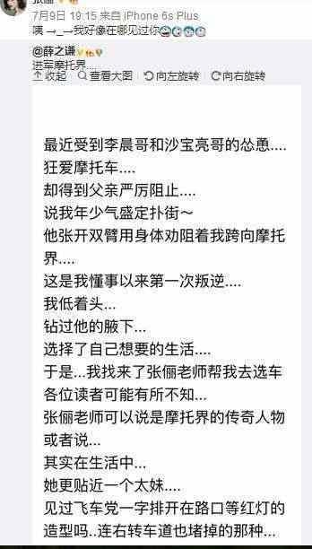 张俪还有一个爱好:重机车。看看薛之谦写给张俪的段子,简直是一个又酷又美的校花啊。