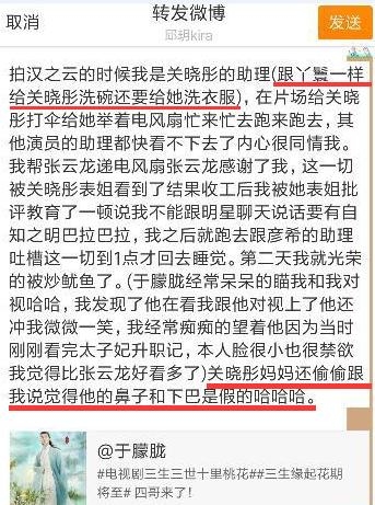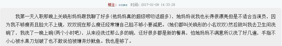 据说关晓彤对助理的要求特别高,前一个助理已经被她的高要求整烦了,在某知名论坛吐槽关晓彤的表姐和妈妈。