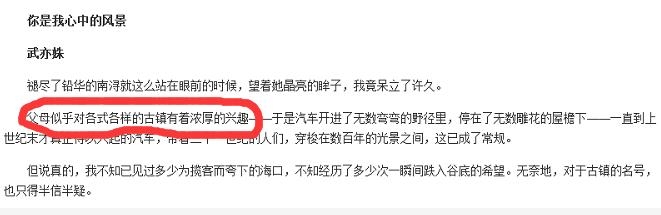 反观武亦姝,她曾经在上海市作文比赛里写过一篇《你是我心中的风景》,记叙的是自己游南浔的事儿,她说记忆里的父母对各式各样的古镇有着浓厚的兴趣。