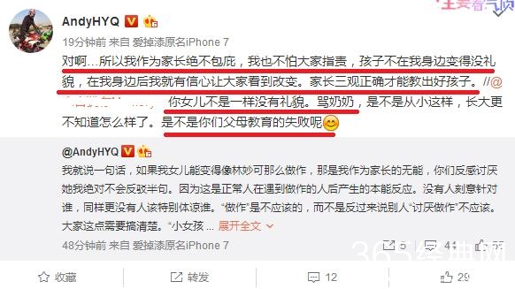 他先是承认了孩子不好的地方,然后说“我作为家长绝不包庇,我也不怕大家指责,孩子不在我身边变得没礼貌,在我身边后我就有信心让大家看到改变。家长三观正确才能教出好孩子。”