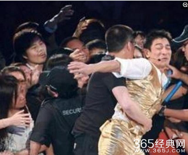 看完上面那些照片,再来看下面这张,刘德华的演唱会上,突破保安去送花的粉丝遭到保安围殴的时候,华仔跳下将近2米的舞台去保护。试问哪个追星狗不想被自己的偶像这样保护