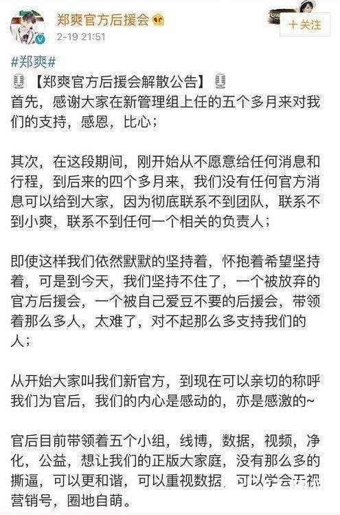 2月19日晚上郑爽官方后援会宣布解散,说“一个被放弃的官方后援会,一个被自己偶像不要的后援会,带领那么多人,太难了”,一小时后贴文遭删除。