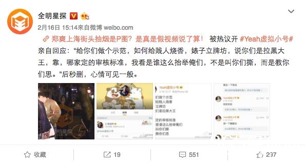 2月16日,卓叔在微博上发视频亲证郑爽抽烟事实,还附赠了郑爽的微博小号“Yeah虚拟小号”。第一条就是劲爆的怒怼卓叔的微博,一直被禁止开微博账号的郑爽感觉全程开了挂。