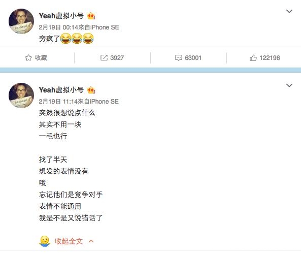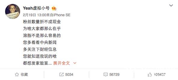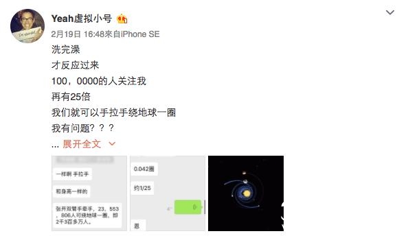 2月19日更在小号上提出“粉丝数量折不成现金”,于是呼吁大家每人一块钱。粉丝2天怒涨到100W,自己说“再有25倍,我们就可以手拉手绕地球一圈,我有问题???”