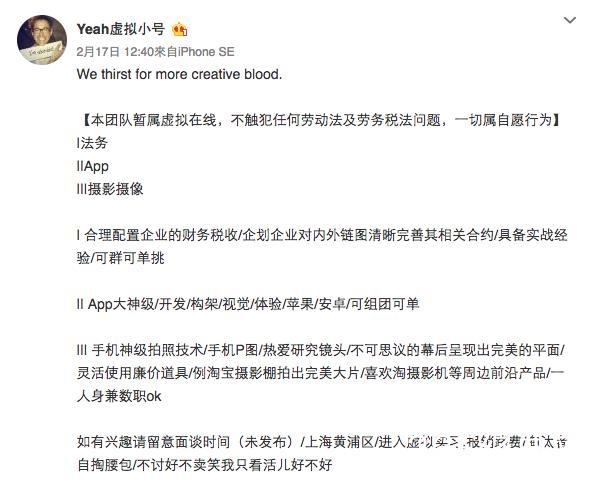 郑爽在小号上公开招人,“APP大神级别·····手机神级拍照技术····会手机P图····一人身兼数职”。