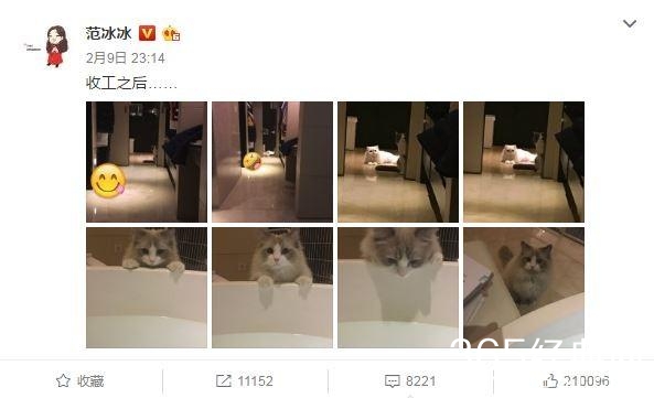 不过在吸取上次自拍被骂的教训之后,范冰冰这次微博晒图变得聪明了。2月9日她在微博晒出8张收工之后的生活照。照片中貌似是范冰冰正在浴缸里面泡澡,可见她是一边洗澡一边拍下猫咪的。