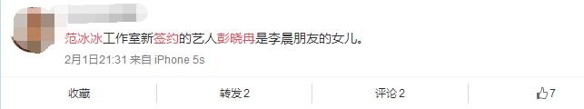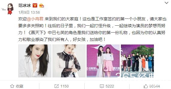 1月9日,范冰冰发布微博,欢迎工作室第一位签约艺人彭小冉