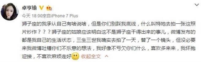 随后该女身份也曝了光,是位名叫卓亨瑜的模特儿,之前就曾在微博晒过当替身的照片,并发文「穿越来回一趟不容易」,而今天新闻登上热搜,就有网友质疑她特地Cos杨幂蹭热度。对此,卓亨瑜发文称清「《三生三世》我确实去拍了一天,替了一个镜头」,但见到众网友酸她借机炒作,她也忍不住回呛:「我好像不亏欠你们什么,喜欢多来来,我怀抱迎接,不喜欢麻烦走好」,耿直回复引发不少讨论。