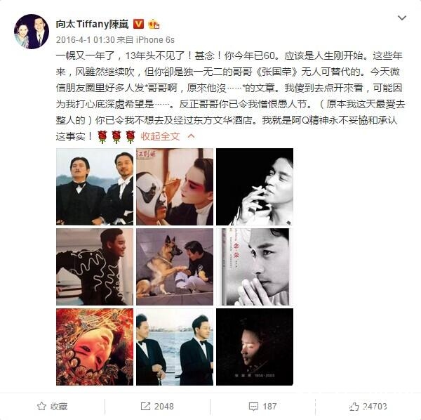 向太自己早在凌晨也发了纪念哥哥张国荣微博,随后又转发了其丈夫向华强怀念哥哥的微博。