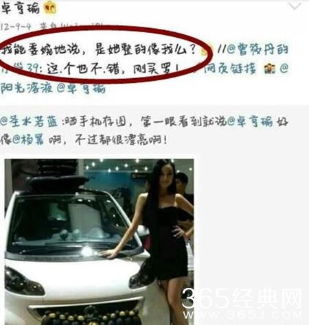 网上一开始曝光的是卓亨瑜穿杨幂在《三生三世十里桃花》剧中白浅戏服的一张自拍,于是有网友跑到她微博下留言,说她是照着杨幂整的。