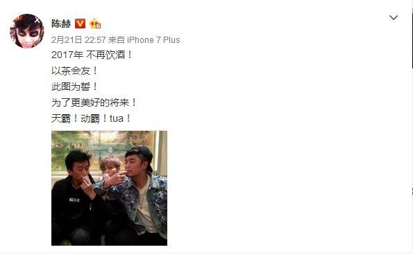 陈赫发图,配文最有意思。2017,不再饮酒,以茶会友,以图为誓。