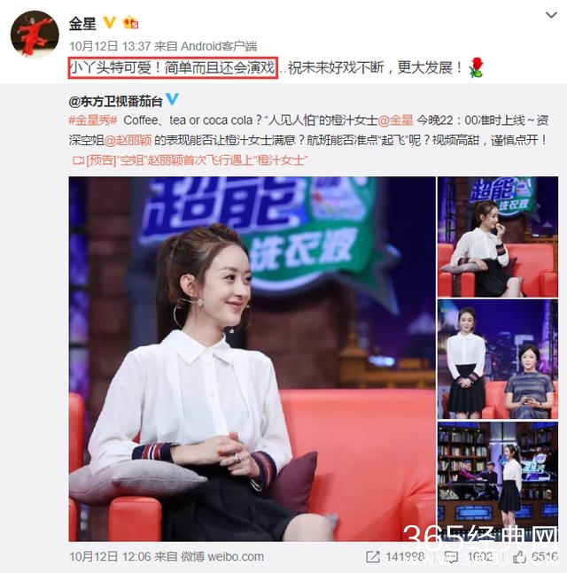 赵丽颖上《金星秀》,金星便转转发微博说:小丫头特可爱,简单而且还会演戏。