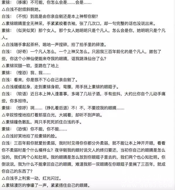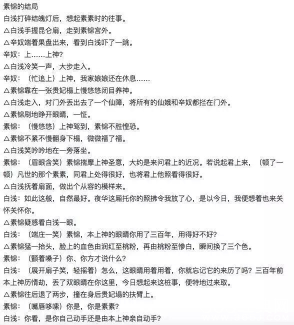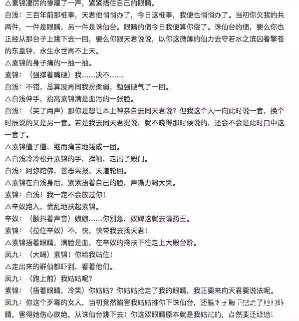 今日,《三生三世十里桃花》中白浅像素锦讨回双眼这段戏份的剧本被网友爆出。自我们素素跳下诛仙台之后,真正开启了她全手王炸的开挂人生,而素锦却只能要不起~