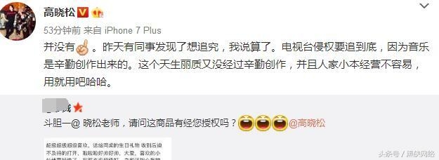 “并没有。昨天有同事发现了想追究,我说算了。电视台侵权要追到底,因为音乐是辛勤创作出来的。这个天生丽质又没经过辛勤创作,并且人家小本经营不容易,用就用吧哈哈。”