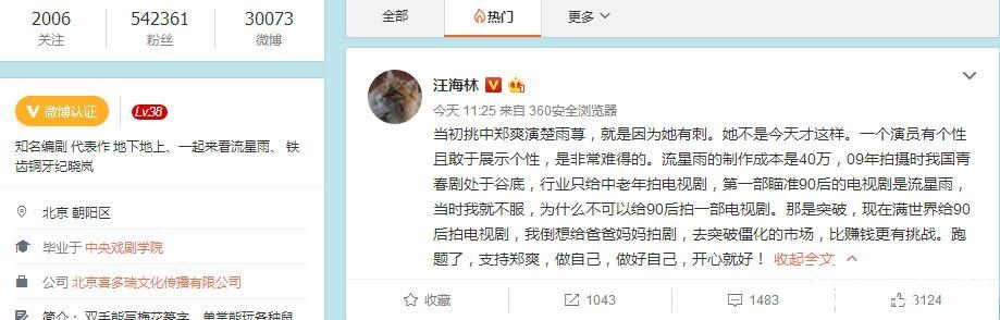 同样《一起来看流星雨》的编剧汪海林也在微博中力挺郑爽。他称当时挑郑爽饰演楚雨荨时,正是因为郑爽身上有刺,她不是现在变成这样,她是一直很个性。一个有个性而且敢于展示个性的演员,是非常难得的。对于郑爽的自我放飞,汪海林力挺小爽:支持郑爽,做自己,做好自己,开心就好!