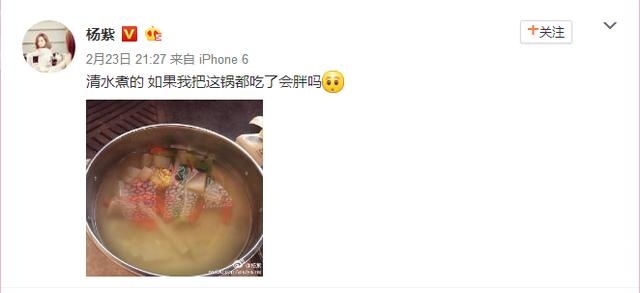 昨天晚上杨紫在微博晒出了一锅清水煮的蔬菜,还问大家"清水煮的 如果我把这锅都吃了会胖吗"