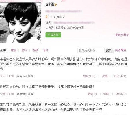或许因前夫的原因,两人感情不和,结果迁怒于河南人,连发数条微博,文中用词犀利,大骂河南粉丝是“招人讨人嫌”、“无知的小傻逼”等等。小编的大学是在河南上的,还是好人居多吧。地域黑确实过分了