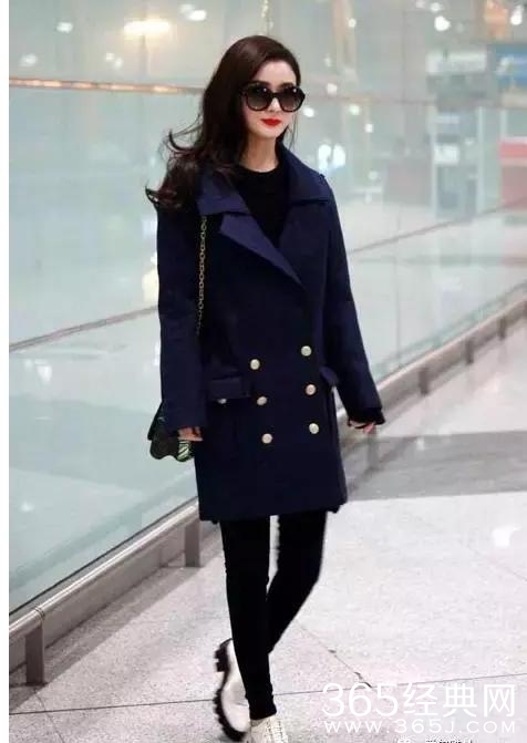 藏蓝色中长款大衣精致的双排扣设计,金色扣子是一大亮点,搭配黑色打底衫和黑色小脚裤,大方秀出筷子腿。再配上墨镜,衬出肤质的白嫩,满满都是胶原蛋白,好想捏一下!