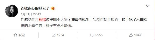 虽然距《甄嬛传》的播出已经过去了六年,但这部剧至今仍是无数人心目中不可忘却的经典,这不最近我在翻看知名大V燕公子之前的微博时,突然发现她曾发了这么一条和网友互动的话题:“你感觉你是甄嬛传里的哪个人物”?她还率先说出自己的答案:“我觉得我是温宜,晚上吃了木薯粉裹的水煮牛肉,肚子有点不舒服。”