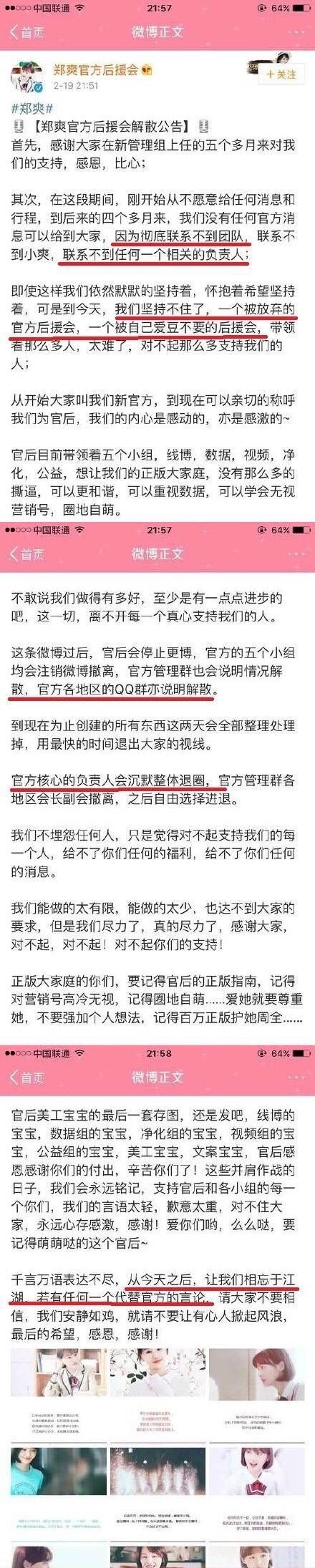 郑爽的官方后援会,前几天突然在微博上宣布解散,并且表示,解散原因是长期联系不到郑爽及其团队,还说自己是一个被自己爱豆(偶像)不要的后援会,不过稍后他们又修改了说法,再次证实后援会解散,但替郑爽圆场,“不是她不需要粉丝,而是她不希望我们管理组辛苦,牺牲太多,而影响自己的现实生活。”