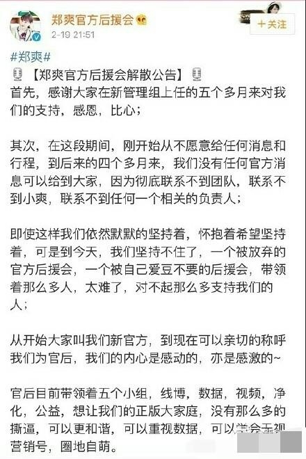 前不久,郑爽的后援会解散了