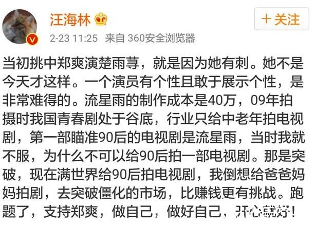 如今事件已经过去一段时间了,小爽的人气不减,每一条微博总在发出不久就能有上万的评论,流量小花真不是瞎叫的。而这几天小爽的一些昔日好友也站出来力挺她,《流星雨》的编剧说,起初选了小爽演楚雨荨就是因为她有刺,真性情本来就是小爽的性格,娱乐圈这些年她选择沉默不语,不代表她变了。