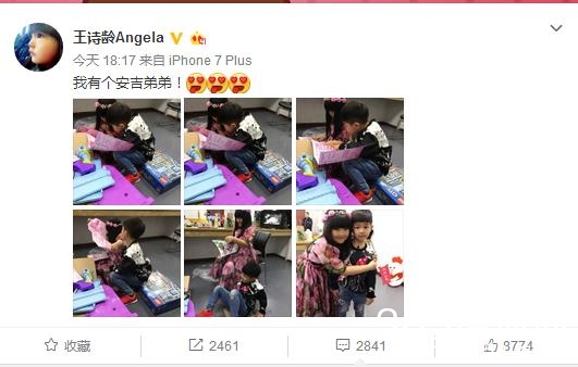而今天,王诗龄在微博晒出一组和安吉的合影,并且配文称:我有个安吉弟弟!