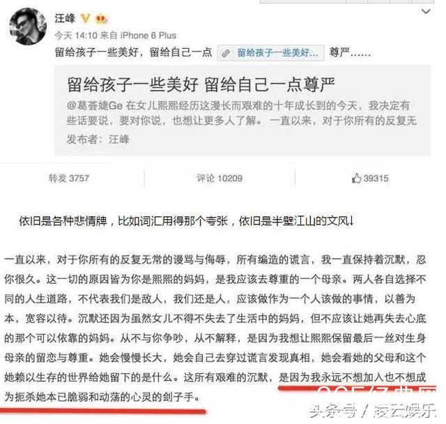 后来汪峰实在是看不下去了也忍不了了,就在网上发布了对葛荟婕的一封长达1300多字的信,信中称“今天,决定不再沉默的一个原因是因为过去你一直歪曲与攻击的是我,基于以上所有的想法我都在沉默与承受,而这两天你竟然开始恶意攻击无辜的人,她是我的妻子,也是我尊重的人。作为一个男人,作为丈夫与父亲,我不答应!没有人能限制你表达想法的权利和自由,但如果你执意还要继续无端的伤害,请冲着我来,不要伤害我的家人,不要伤害真心实意对你女儿好的人!如果你真爱孩子,你应该欣慰,多一个人真心的爱熙熙难道对孩子不好吗?”