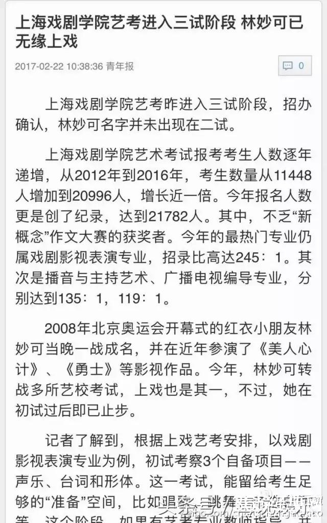 而奥运女孩林妙可则非常不幸了,在初试中就被刷掉了,不过最近进了南艺的复试,也是一个好消息了。