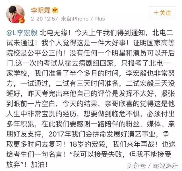 但是天意弄人李宏毅无缘北电,而且据说只报了这一个学校,李宏毅的哥哥也发了一条微博。