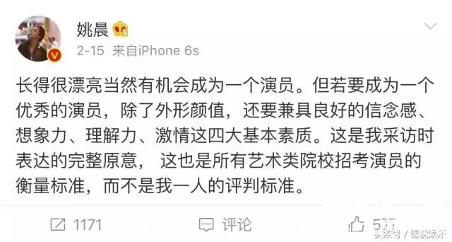 其实说到明星艺考官,今年上戏邀请了胡歌与姚晨作为明星艺考官,姚晨更是在微博上表示一个优秀演员应该具备的条件。