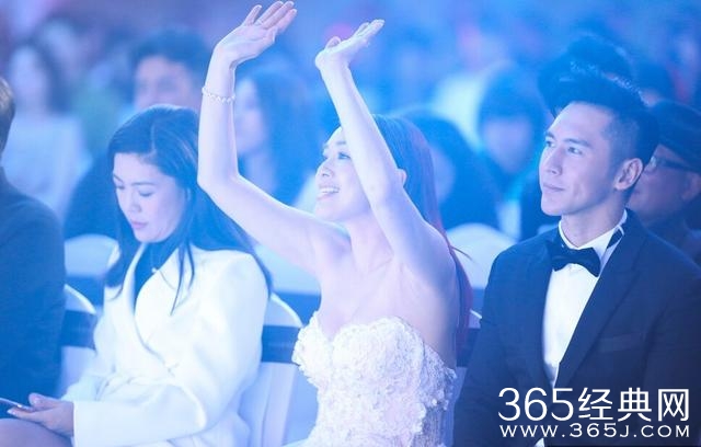 钟丽缇穿着白色抹胸裙亮相,脚上的金色高跟鞋相当抢眼。钟丽缇张伦硕走到哪狗粮撒到哪,台上甜蜜恩爱秀一脸~