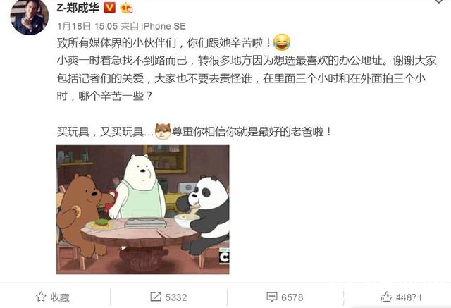 先聊聊郑爽爸爸郑成华吧,他几乎已算是郑爽在粉丝面前的代言人了。在郑爽未开小号之前,有什么事爸爸微博都会做官方代表说话。