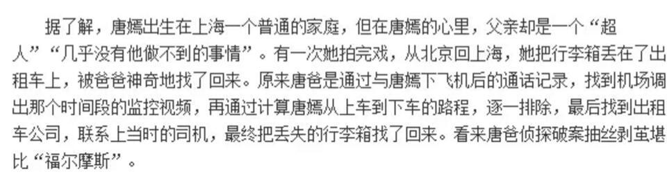 还有一次,唐嫣自己爆料说爸爸的一件事,表达了自己对爸爸的依赖:有一年唐嫣一年都没回家,因工作太忙了。他爸爸就自己偷偷潜入片场去看她拍戏,远远看着我工作,等到唐嫣看见她的时候他还“嗨”了一下。