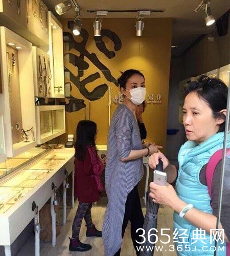 王菲戴着口罩,带着女儿李嫣在金饰店漫步。