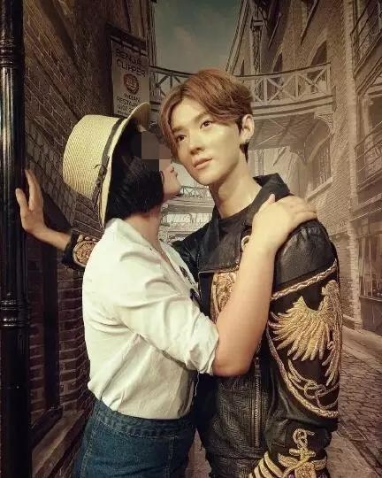 据说蜡像唇部的颜色都快被亲没了,小编真是十分心疼鹿晗......的蜡像啊
