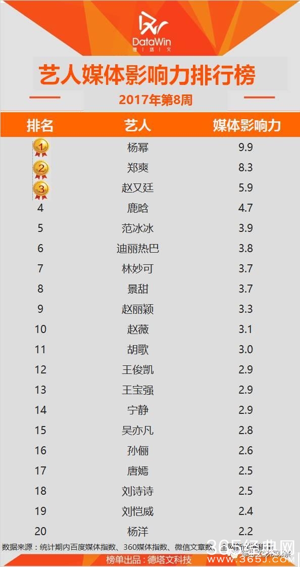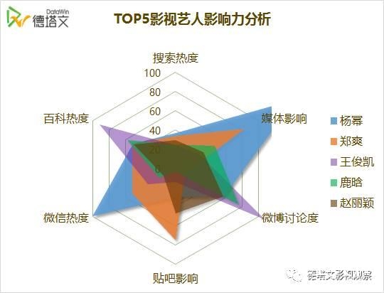 媒体指数体现了艺人的大众影响力以及其团队的营销力度。本周《三生》的广泛影响力让杨幂、赵又廷和迪丽热巴都指数靠前,90后新生代艺人则属郑爽和鹿晗的媒体热度和营销幅度最高。