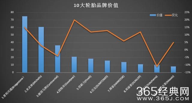 在这次轮胎行业的十大品牌价值中,有八个品牌价值比去年上升,其中固特异上涨20%增长最快。而优科豪马下降11%,贬值最大。我们来看下具体的评价分值,到底这些品牌价值多少钱?