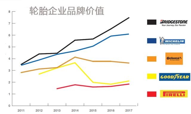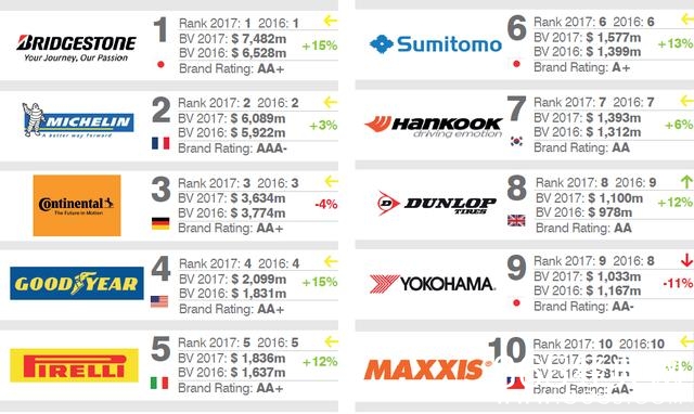 2017年2月,汽车行业的品牌评估机构英国品牌财富(Brand Finance)公布了“2017全球轮胎品牌十强榜”,和2016年相比,几乎没有发生变化。在最新的全球轮胎品牌价值最高的品牌中,日本普利司通以74.82亿美元蝉联榜首,不过来自法国的米其林集团虽然价值排名第二,但是其品牌等级是最高的3A级,也是唯一一个3A级的品牌等级。